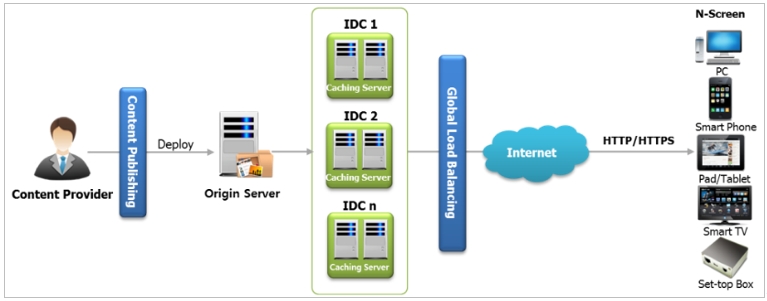 즉, 원격지(Origin Server)에 있는 원본 콘텐츠를 IDC 센터내 에지서버에 캐싱하여 사용자가 요청한 콘텐츠를 사용자와 가까운 에지서버(=캐시서버)에서 직접 콘텐츠를 전송함으로써, 콘텐츠 요청에 대한 응답속도, 로딩타임 등을 개선하여 사용자의 서비스 경험을 극대화하는 서비스 입니다.