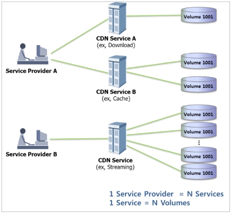 서비스별로 계약을 체결하지만, 실제 서비스하는 단위는 볼륨입니다. 전체 계약 용량을 여러 볼륨으로 나눠서 서비스가 가능합니다. 서비스 하위에는 1개 이상의 볼륨이 반드시 존재합니다. 고객사는 계약한 서비스의 트래픽 및 디스크 용량을 1개 이상의 볼륨으로 나눠서 서비스할 수 있으며, 도메인에 의해 볼륨별 서비스가 구분되어 최종 사용자에게 서비스가 제공됩니다.