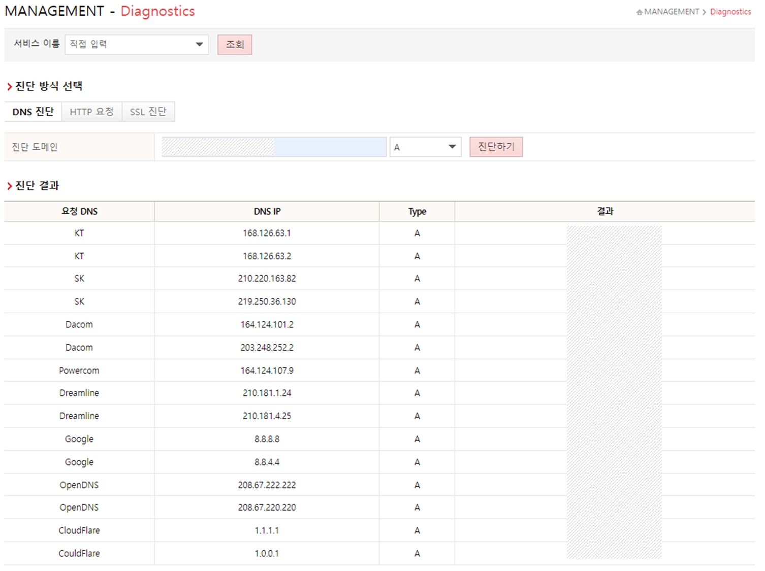 CDN 서비스에 대해 간단한 진단을 수행 할 수 있는 메뉴 입니다. 서비스를 선택 하거나 직접 입력을 통해 서비스에 대한 진단을 수행 할 수 있습니다.