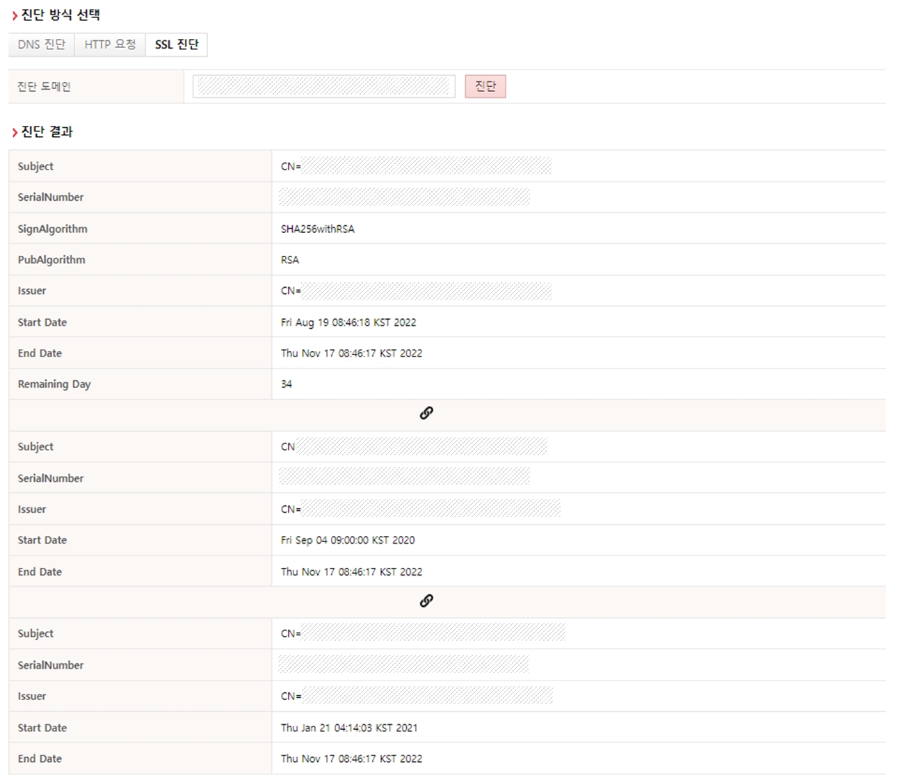 진단 도메인 입력을 통한 SSL 인증서 검증을 진행 합니다. SSL 인증서에 대한 정보와 체인 인증서에 대한 정보를 출력 합니다.