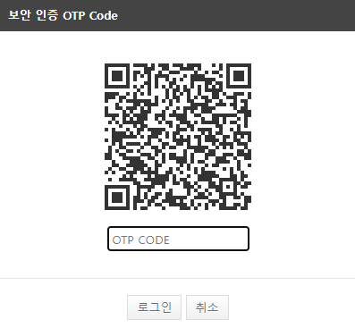 OTP 코드 입력을 통한 로그인이 처음 일 경우 OTP등록을 위한 QR 코드가 화면에 표시 됩니다.