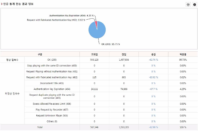 스트리밍 서비스는 비정상적인 경로를 통한 콘텐츠 재생을 막기 위해 인증을 요청하는 경우가 많습니다. 최종 사용자가 인증을 통해 콘텐츠에 정상 혹은 비정상으로 접속한 수와 비율을 보여주는 것이 인증 통계입니다. 비정상 접속 통계는 응답 코드와 비정상 접속 원인에 따라 분류해서 살펴볼 수 있습니다. 시간 단위는 일, 주, 월, 그리고 특정 기간입니다.