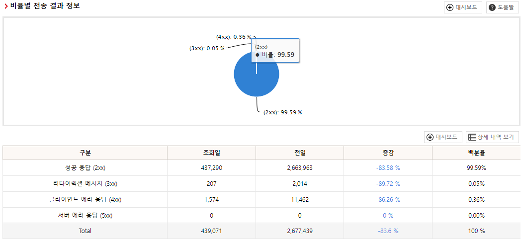 비율별 전송 결과는 응답 코드에 따라 총 발생 건수와 비율을 보여줍니다.