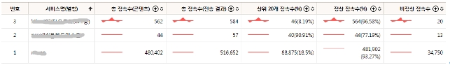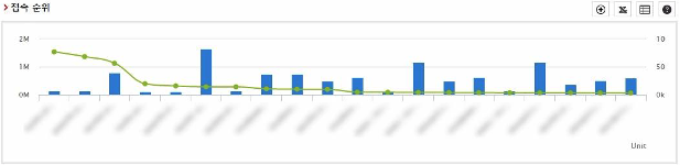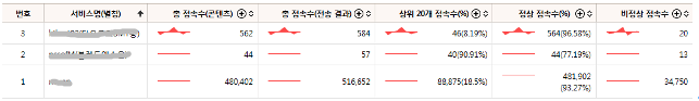 콘텐츠 접속 순위 통계는 서비스 중인 콘텐츠 중 접속이 많은 상위 20개의 콘텐츠 정보를 기본으로 보여주며, 최대 상위 50개의 콘텐츠 정보까지 확인할 수 있습니다.