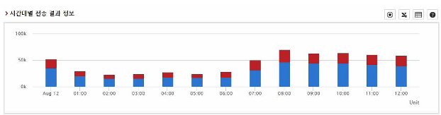 시간대별 전송 결과는 응답 코드를 대역별로 분류하여 시간대별 총 발생 건수를 보여줍니다. 일 단위의 경우 1시간의 총 전송 결과를 기준으로 제공됩니다. 주, 월, 특정 기간 단위의 경우 1일 동안의 총 전송 결과를 기준으로 제공됩니다.