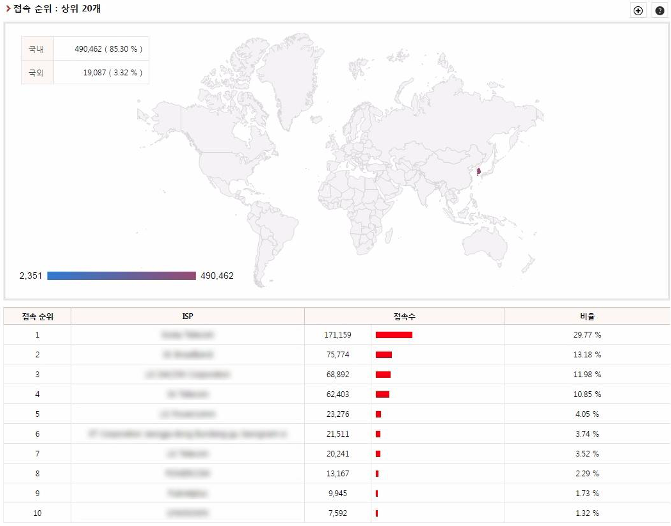 Location 통계는 국내외를 모두 포함하여 접속이 많은 상위 20개의 ISP를 기본으로 제공합니다. 원하면 최대 상위 50개의 ISP 업체까지 확인할 수 있습니다.
