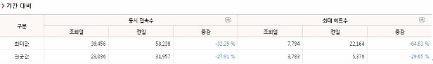 조회일을 기준으로 전일, 전주 및 전월 동시 접속수, 누적 히트수, 최대 히트수 통계 정보를 비교해 볼 수 있습니다. 비교 데이터는 최대값, 평균값 그리고 증감률입니다.